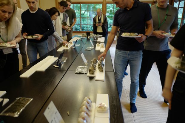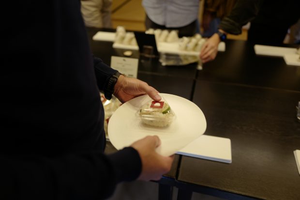 温かいお味噌汁とともにおにぎりを味わう参加者のみなさん。「おにぎりは好きだけど、こんな味は初めて」や、「海苔を自分で巻くのがおもしろい」など会話も弾んでいるよう。「米沢牛しぐれ」や「ポーク玉子」も人気でしたが、ベジタリアン向けメニューの「羅臼昆布海苔とカリカリ梅」や「高菜」があることで「選択肢が多い」という声もありました。