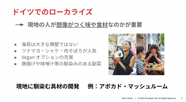 ヨーロッパでの実践として、「Tokyo Gohan」の土屋亮泰さんがドイツでの展開を紹介。同社は2021年にドレスデンで創業し、現在はベルリンにも2号店を構え、2店舗で運営しています。始まりはウイークリーマーケットで机ひとつだったといい、そこから店舗へと歩みを進めてきました。