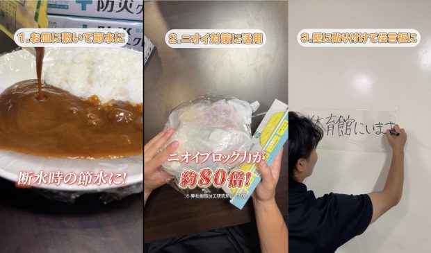 「防災クレラップ」と「サンホイル」の活用方法をみてみると、日常品が非常時には防災アイテムとして転用されていることがわかります。