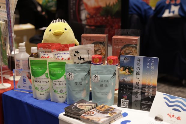 今治市の名産のひとつが「伯方の塩」。「伯方の塩」という商品名も今治市の伯方島から取られています。ブースには今治市のPRマスコット・バリィさんもちょこんと登場。