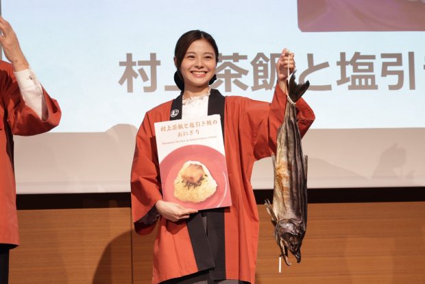 新潟県村上市スペシャルアンバサダーの本間日陽さんがステージに登場する際に、手に持っていたのが村上市の名産である塩引き鮭です。日本海からの寒風で熟成され、独自の旨味が増すと冬の季節は塩引き鮭を軒下に吊るす風景が見られるそう。