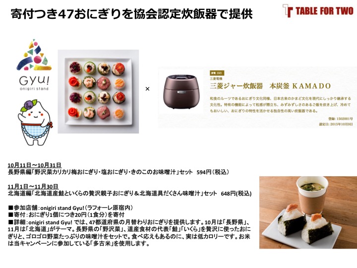 本日から! おにぎり協会、世界食糧デー「TABLE FOR TWO」おにぎりソーシャルアクション2016に参加