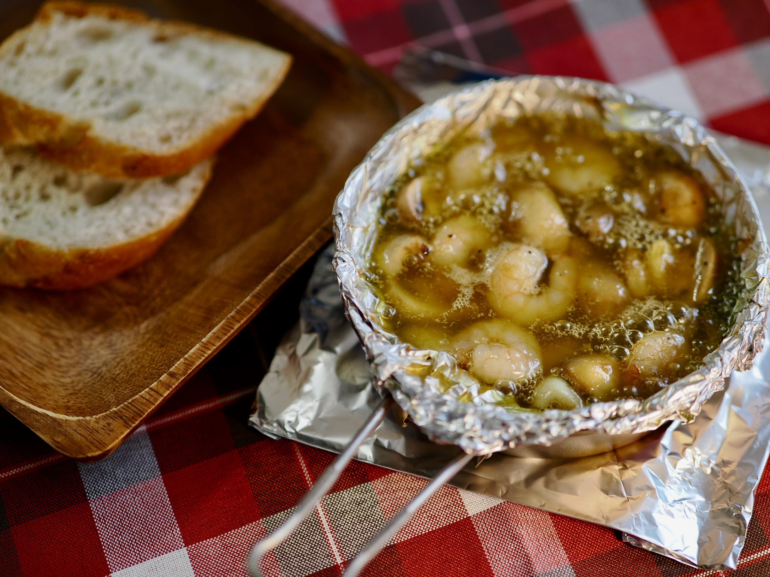 まずはアヒージョから準備をしていきます。海老とマッシュルーム、オリーブオイル、ニンニクを用意。フライパンにサンホイル(以下、ホイル)を敷いて、オリーブオイル、ニンニクをいれて弱火にかけます。辛いのが好きな人は、ここで鷹の爪を入れるといいでしょう。ニンニクの香りが出てきたら海老とマッシュルーム、塩を少し入れていき、弱火で10分~15分程度加熱します。全体が美味しそうな色になったらブラックペッパーをかけてできあがり。フライパンをホイルで覆うことで、終わった後は油を処理して捨てるだけでOK。容器を洗う手間がなくなるのがポイントです。